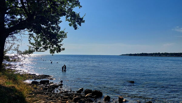 Nach der Rückkehr in unserer Zimmer machen wir uns was zu essen, einen Mittagsschlaf und fahren dann in nördlicher Richtung, am Krankenhaus vorbei - und sehen ein großes Kreuzfahrtschiff in der Bucht vor Rovinj. Naja. Am Strand beginnt eine Kette von Hotels, Zeltplätzen, Liegewiesen - es nimmt kein Ende. Teils ist Manches schön angelegt, viel jedoch auch „einfach so“, recht geschmacklos. Auch recht weit entfernt von dem, was wir auf der Südseite gesehen haben, wo es vor den drei großen Hotels richtig große Jachten am Hafen gab, erst dahinter begannen die Liegeplätze: Hier ist es weniger luxuriös, aber einfach grenzenlos ausgedehnt.