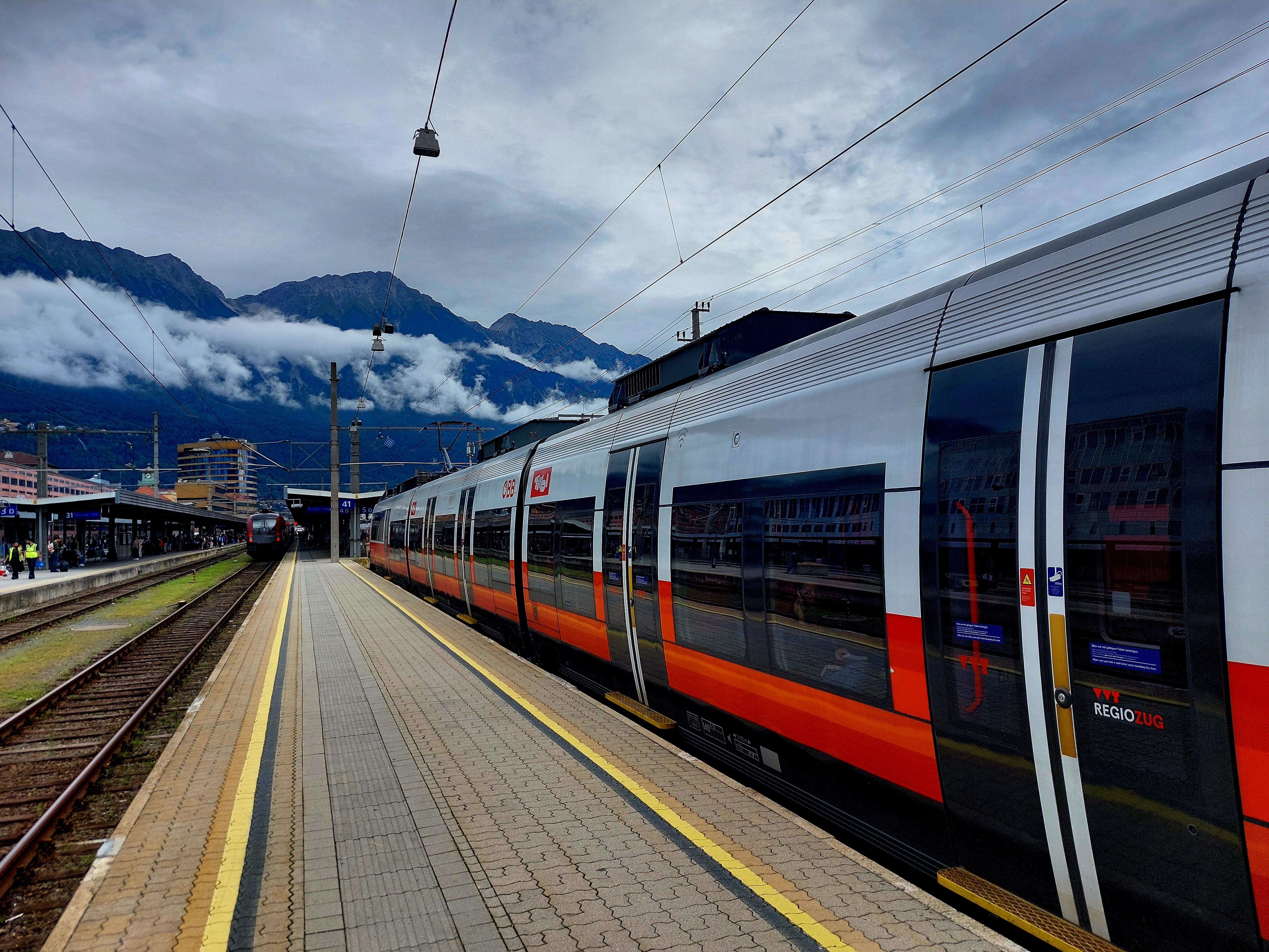 Wir kommen rechtzeitig am Bahnhof an, blitzschnell habe ich die Tickets für den Zug auf den Brenner gekauft - und der kommt auch schon 20 Minuten früher, sodass wir einen der nicht besonders vielen Radplätze kriegen. Mal schauen, wie sich das Wetter entwickelt: Zurzeit ist es wolkig, nicht gerade warm - doch über dem Brenner könnte es auch wieder anders aussehen.