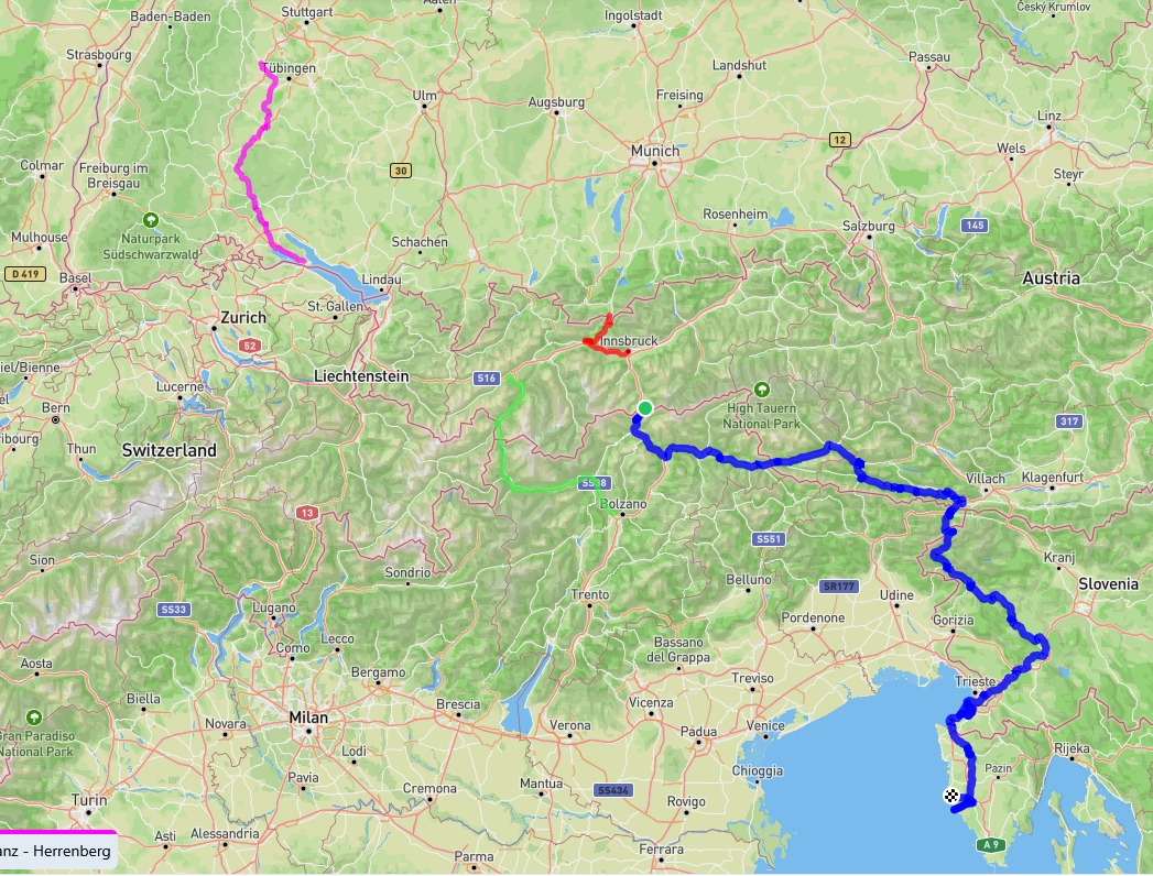 Für den Rückweg nehmen wir die Fähre von Porec bis Triest, ab hier den Zug nach Bozen. Mit dem Rad fahren wir das Vinschgau hinauf zum Reschenpass, dann abwärts bis Landeck. Wegen starkem Regen, dem wir ausweichen, steigen wir erneut in den Zug, fahren über Buchs nach Konstanz. Von hier aus runden zwei schöne Rad-Tage über die Schwäbische Alb bis Herrenberg die Radtour ab. Insgesamt haben wir dann gut 1.100 km mit mehr als 11.500 hm in den Beinen.